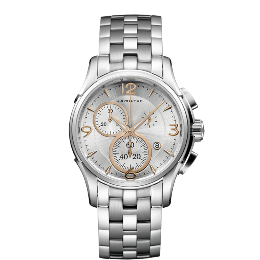 Hamilton Jazzmaster Chrono Quartz 42 mm watch. Model reference: H32612155. Stainless steel case. Silver dial. Rose gold indexes and hours indicators. Quartz movement. Sapphire glass. Stainless steel bracelet with a folding clasp. Water resistance: 10 bar (100 m) /145 psi (328 ft). This Hamilton watch comes in original packaging with set of documents and 2 years warranty. At Watches of Mayfair we offer new authentic watches at the best prices.